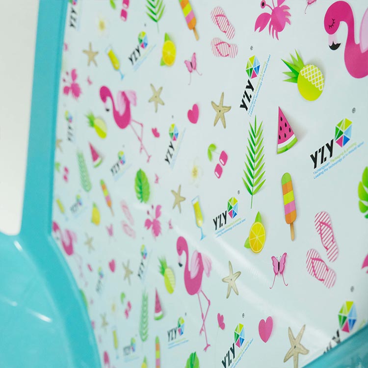 Dopo numerose discussioni e prove, alla fine è stato adottato lo schema di abbellimento delle parti. YZY ha applicato solo l'etichetta per stampaggio a iniezione di sedie impilabili in plastica nell'area centrale dello schienale della sedia, che non solo ha evitato l'affaticamento visivo causato dalla stampa su larga scala, ma ha anche migliorato la competitività differenziata del prodotto del cliente attraverso riflessi decorativi. Il layout dei modelli di design era opportunamente denso e scarno e, allo stesso tempo, il logo del marchio del cliente e i modelli di design erano integrati, ottenendo la duplice funzione di decorazione e diffusione del marchio. Rispetto alle piccole stoviglie, le etichette IML delle sedie YZY utilizzano una pellicola composita PET/PP ispessita, che combina tenacità e resistenza alle alte temperature ed è adatta per lo stampaggio ad alta pressione in stampi di grandi dimensioni. Lo schienale della sedia ha una struttura curva e le etichette devono essere preformate in 3D per adattarsi alla curvatura dello stampo. Il processo IML può raggiungere un elevato grado di uniformità dei modelli per i prodotti globali, combinato con un design resistente agli agenti atmosferici, può soddisfare i requisiti dei mercati esteri.